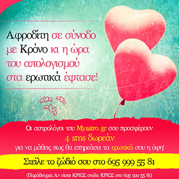 Στείλε το ζώδιό σου στο 695 999 55 81 και θα λάβεις στο κινητό σου 4 δωρεάν απαντήσεις με sms από τους κορυφαίους αστρολόγους του Μyastro!